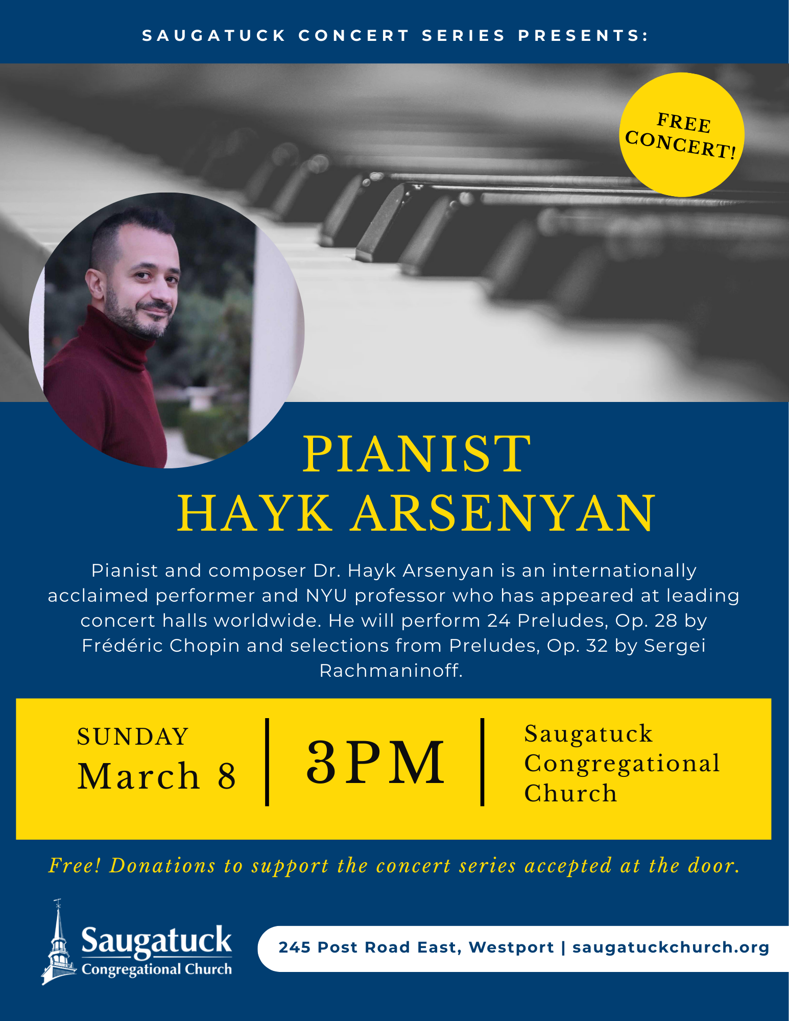 Free and open to the public; no tickets required. Donations to support the concert series accepted at the door.
